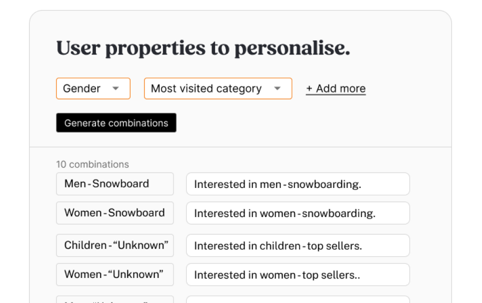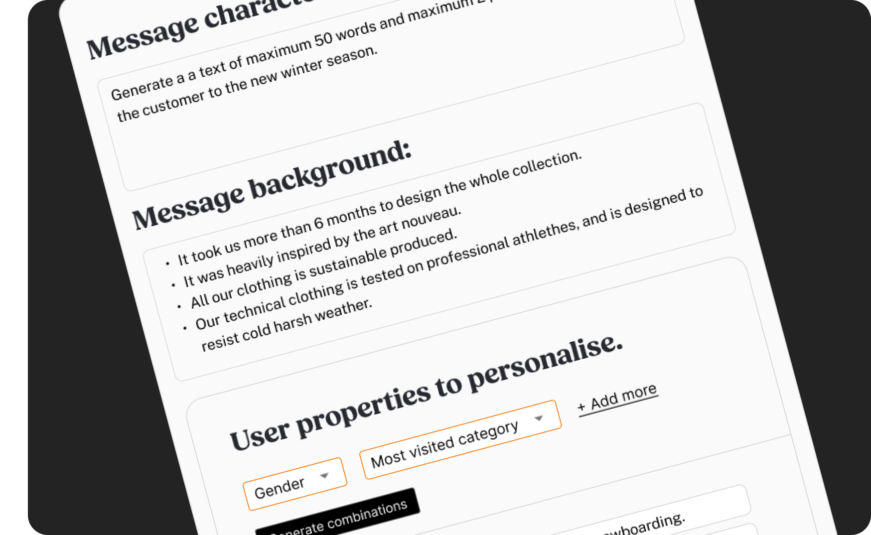 Use AI to create content inside your journeys using any user & event data living inside the platform. Use it in any other action in the marketplace.